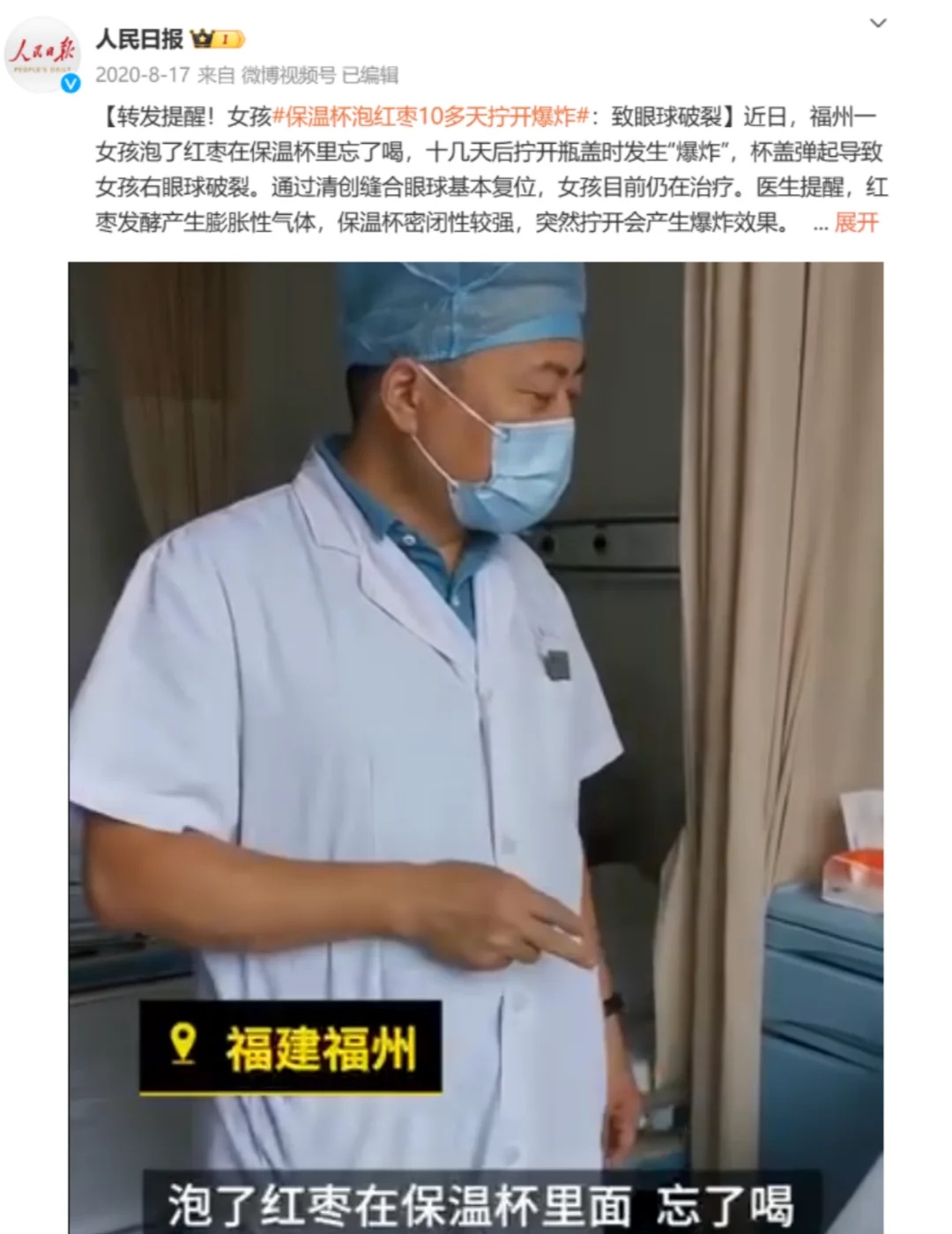 巨大的压力会冲击杯盖,一旦弹出击中头部面部可能造成人身伤害,所以奉劝大家保温杯里不要放红枣。